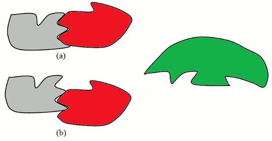 Benzer analiz fikrini 3B şekil eşlemesi problemine de uygulayabiliriz. Yan tarafta 3B şekillerden alınan 2B kesitleri görüyoruz (gri, kırmızı, yeşil). Eğer sadece gri ve kırmızı şekilleri dikkate alırsak (a)'da gösterilen eşlemeyi kabul edecekken tüm şekilleri dikkate aldığımızda (b)'deki eşlemenin daha iyi olduğunu görüyoruz. Bu takım kurnaz detaylar 3B şekil analizini zorlu ve bir o kadar da zevkli kılan özelliklerdir.