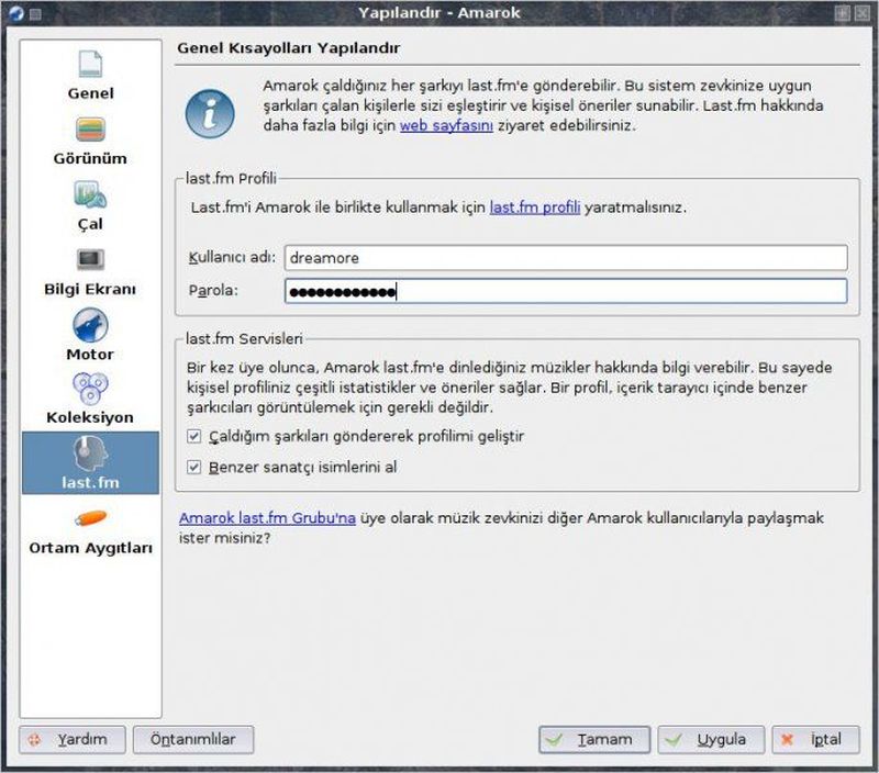 Bahsedilmesi gerektiğini düşündüğüm bir şey de Amarok ile last.fm keyfi... Sadece last.fm ile ilgili dakikalarca konuşabilirim, ama meraklanmayın, özetleyeceğim sadece. Last.fm son zamanlarda popüler hâle gelen, insanların müzik zevklerini önce algılayıp, sonra 'nabza göre şerbet veren', internet radyosu. 'Audioscrobbling' özelliği ile dinlediğiniz parçaları veritabanına kaydeder ve siz yeni parçalar dinledikçe o sizin müzik zevkinizi analiz eder. Yeterince parça dinledikten sonra ise, size kendi favori parçalarınızı 'tıkır tıkır' çaldığını görebilirsiniz... Peki nedir Amarok'un bu konuyla ilgisi? http://www.lastfm.com.tr'den edineceğiniz last.fm hesabınızı Amarok'a tanıtarak rahatça kullanabilirsiniz. 'Ayarlar' -> 'Amarok Programını Yapılandır' kısmında, solda last.fm sekmesine tıklayarak hesabınızı tanıtın ve bırakın, Amarok siz sadece dinlerken; dinlediğiniz parçaları last.fm'e bildirsin, benzer sanatçı/gruplardan size bahsetsin. Üstelik, 'Çal' -> 'last.fm yayını çal' bölümünden zevkinize göre müzik dinleyin, hem de sabit diskinizde bu parçalar olmasa bile!