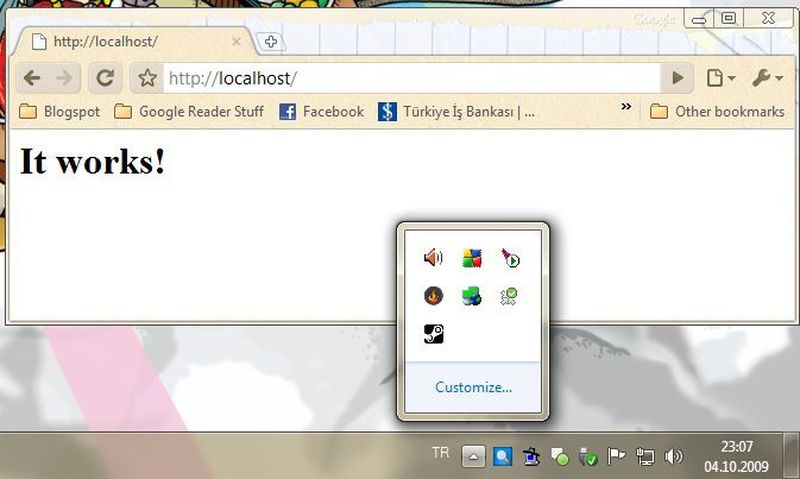 Test: Sunucunuzun çalıştığını test etmek için tarayıcınızı http://localhost adresine yönlendirin. Bilgisayarınızda daha önce kurulu bir Apache sunucu yoksa Apache sunucu ile gelen varsayılan başlangıç sayfası ekrana gelecek ve çıktı "It Works!" olacaktır. Aşağıdaki ekran görüntüsünde düzgün kurulmuş bir Apache sunucunun açılış sayfası görülmektedir. Sağ alt köşedeki taskbar da Apache Monitor ikonu sunucunun çalıştığını göstermektedir.