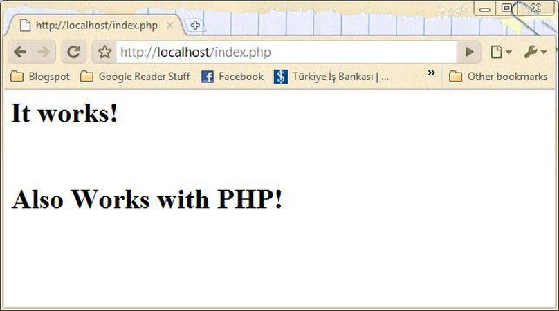 Web tarayıcınızı http://localhost/index.php adresine yönlendirin. Tarayıcınızın sadece "It works! Also Works with PHP!" çıktısını vermesi gerekmektedir. Aşağıdaki ekran görüntüsü örnek çıktıyı göstermektedir.