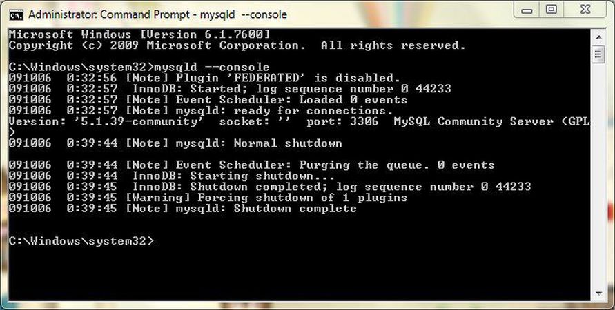 komutunu vermeniz ve şifre sorulduğunda MySQL sunucunun root şifresini vermeniz gerekmektedir. Bu komut satırının administrator yetkisine sahip olmasına gerek yoktur. Aşağıdaki ekran görüntülerinde başlamış bir MySQL sunucuya ait komut satırı, bir MySQL sunucunun durdurulması için kullanılmış bir komut satırı ve durmuş bir MySQL sunucuya ait komut satırı yeralmaktadır.