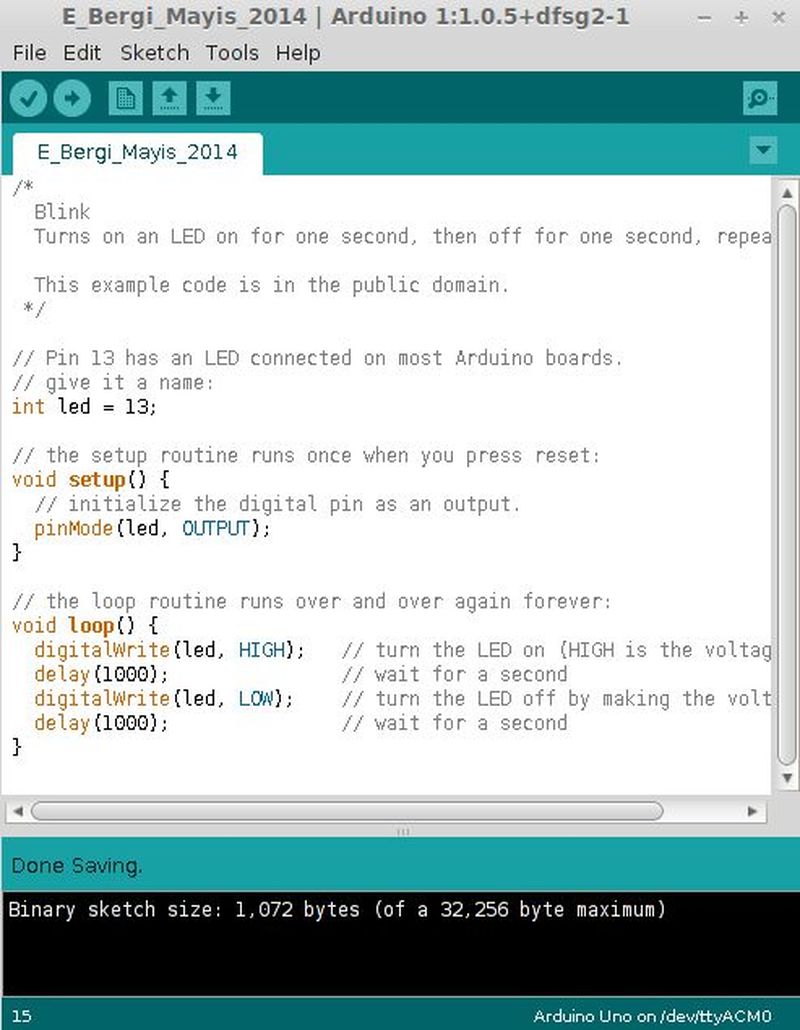 Not: bu kodu File > Examples > Basics > Blink ‘e giderek bulabilirsiniz.