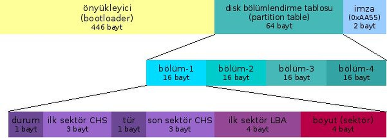 Sabit diskinizin ilk 512 baytında MBR (Master Boot Record - Ana Önyükleme Kaydı) adı verilen veri bulunur. Bu veri aşağıdaki kısımlardan oluşur: