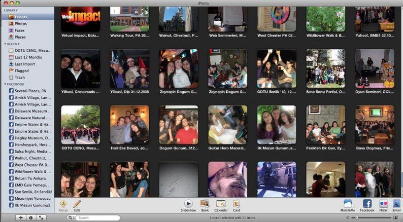 Yine yukarıdaki fotoğrafta soldaki listede görüldüğü gibi, Facebook'ta albüm yayınlamak da çok kolay. Sadece albümü ve/veya fotoğrafları seçerek sol alttaki Facebook butonuna basmanız yeterli. Daha sonra Facebook ile bağlantı kurulacak ve şifreniz sorularak albüm gizliliğine karar vereceksiniz. Gerisi tamamen iPhoto'ya kalmış. Evet evet, yanlış duymadınız tamamen: iPhoto'da Faces kullanarak etiketlediğiniz yüzler bile Facebook'ta isim etiketleri olarak aktarılıyor!