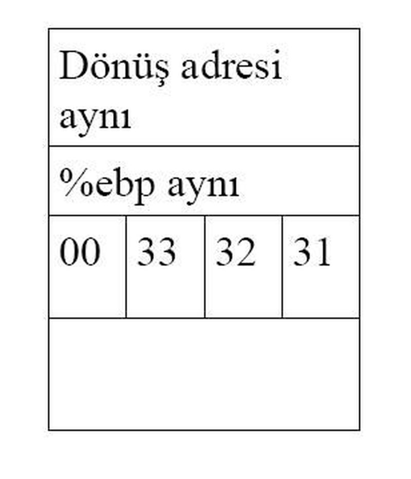 Son olarak da “123456789” girildiğini düşünelim. Bu durumda yığıttaki buffer, %ebp ve dönüş adres kısımları ekrandan girilen girdiyle dolacak ve değerleri değişecekti. Yanlış bir çerçeveye geçilecek ve dönüş adresi de değiştiği için bergi fonksiyonunu çağıran fonksiyonda kalındığı yerden devam edilemeyecekti. Yüksek olasılıkla segmentation fault hatası alınacaktı.