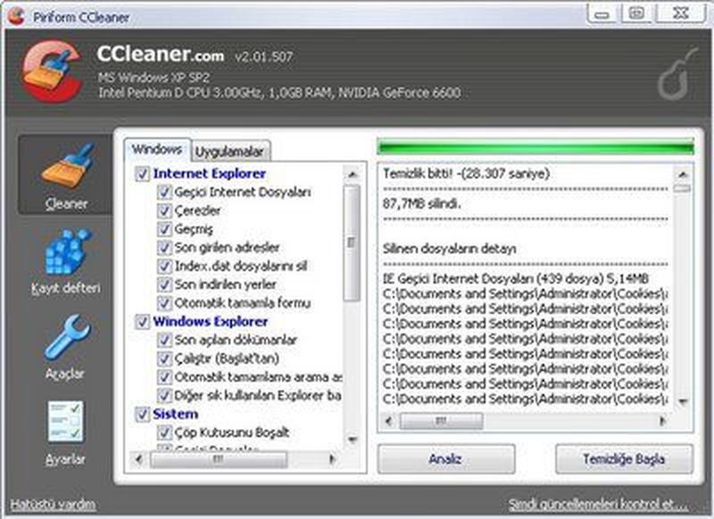 Biraz daha derine inecek olursak, program 4 ana kısımdan oluşuyor. İlk ve en önemli kısım temizlik aracı olan "Cleaner". Burada temizlenmesini isteyeceğiniz kısımlar "Windows" ve "uygulamalar" adı altında iki alt başlığa ayrılmış. Windows kısmı; Internet Explorer, Windows Explorer, Sistem ve Gelişmiş menülerinden oluşuyor.