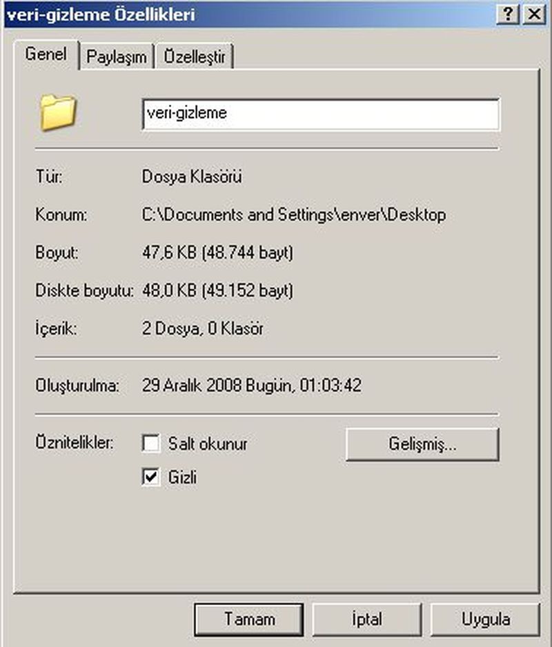 İkinci bir yöntem ise neredeyse tüm bilgisayar kullanıcılarının bildiği, bir şeyler gizlemeye daha yeni yeni başladığımız zamanlardan beri haberdar olduğumuz dizin gizleme özelliği. Gizlenmek istenen dizin hemen özellikler menüsüne girilerek Gizli parametresi verilir ve uygulanır, tabi burada bunun geçerli olması için windows klasör ayarlarında gizli dosyaların görüntülenmemesi seçili olmalıdır.