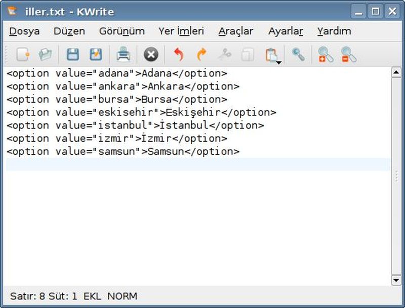 KWrite aracılığıyla düzenli ifadeleri kullanarak arama yapabildiğimiz gibi, bulduğumuz metinleri değiştirme şansına da sahibiz. Bunu da yine bir örnekle görelim. Aşağıdaki resimlerde görebileceğiniz gibi, bu sefer örnek metin olarak bir HTML formundan alınmış şehir listesini kullanıyoruz. Bu listede şehirlerin isimlerinin yanı sıra, Türkçe karakterlerden arındırılmış hali de mevcut. Bu listeyi alıp, kendi PHP sayfamızda kullanabilmek için bir dizi (array) haline çevirmek istiyoruz.