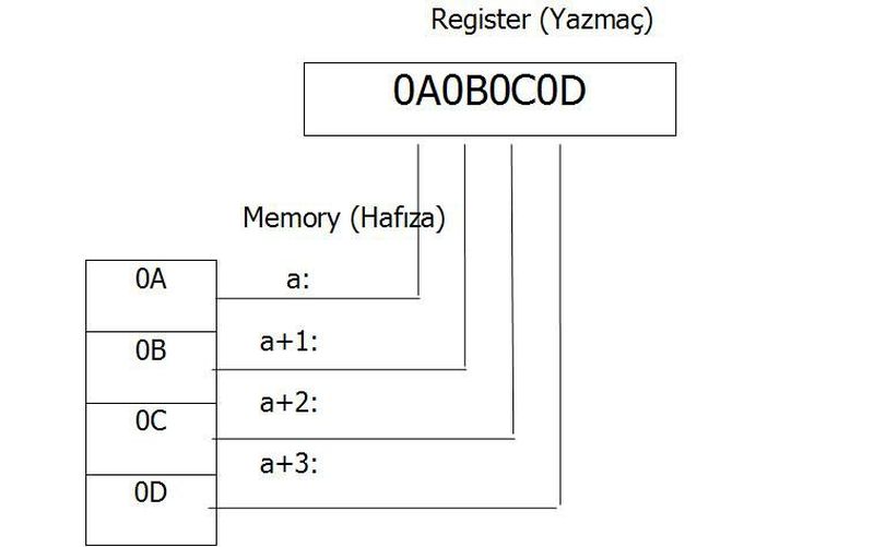 Hafızayı en basit ve kaba şekliyle baytların saklandığı uzun bir dizin şeklinde ifade edebiliriz. Normalde dizindeki herhangi bir yeri ifade etmek için “indis” terimi kullanılırken, bilgisayar bilimcileri hafızadan bahsederken “adres” terimini daha çok kullanılırlar. Her bir adres hafıza dizininin bir elemanını tutar. Bu eleman genelde bir bayt olur ama bu bir zorunluluk değildir. Diyelim ki bir kutucuk (word) 32 bit yani 4 bayt olsun. Tam sayılar, tek duyarlı ondalık sayılar, hepsi 32 bit uzunluğunda yani bir kutu uzunluğundadır. Peki biz bunları hafızayı nasıl koyacağız? Sonuçta her bir hafıza adresi tek bir bayt depolayabilir. Sorumuzun cevabı basit: 32 bit uzunluğundaki sayımızı 4 bayta bölücez. Mesela sayımız 16 tabanında şu şekilde ifade edilsin 12CD34AB16 .16 tabanında her basamak 4 bit ile ifade edildiğinden sayımızı ifade edebilmek için 8 tane 16 tabanında basamağa ihtiyacımız olacaktır. Böylece sayımızı şu şekilde ayırabiliriz: 12 CD 34 AB. Ayrılmış bölümlerin her biri birer bayt oldu böylece. Şimdi gelelim sayımızı hafızada depolamaya. Bunun iki yöntemi vardır.