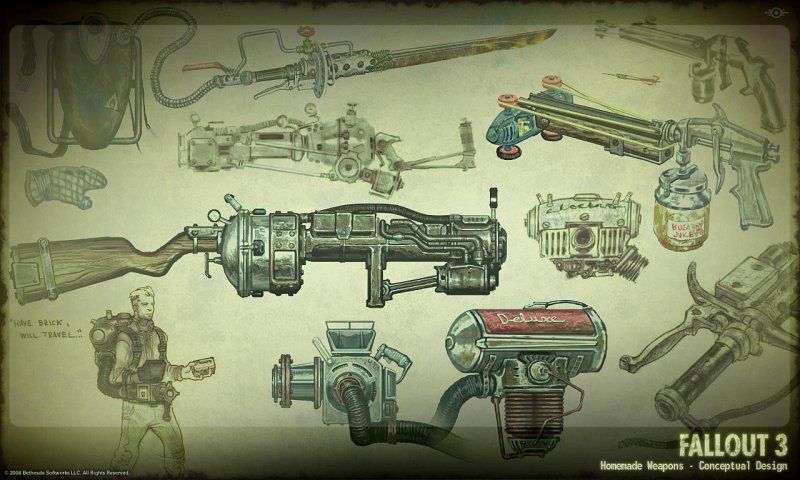 Oyun artık FPS olduğu için silahlara özellikle özen gösterilmiş. Her silahın kendine has bir kullanış zevki var ama hepsini birden kullanmak yerine aralarından birkaç tanesini seçip o silahlar üzerine uzmanlaşmak iyi bir savaşçı olmak için olmazsa olmaz bir adımı oluşturmakta. Oyunda eski serilerden de hatırlayacağımız Av tüfeği (hunting rifle), yarı-otomatik tüfek(submachine gun), otomatik tüfek (assault rifle) gibi silahlar yine ilk karşılaştığımız silahlar olacaklar. Kolay bulunabilir silahlar olmaları ve cephane sıkıntısının az olması ilerde de kullanmamızı gerektirecek. Ama eğer daha ağır silahlardan hoşlanıyorsanız ağır makineli(minigun), roket atar(rocket launcher), alev silahı(flamer), lazer silahları(laser pistol-rifle, gatling laser) ve plazma silahları (plasma pistol-rifle) gibi silahlar da bulunmaktalar. Hatta ilk oyunda bulmak ve kullanmak için bir hayli uğraştığımız ağır makineli, ilk 1-2 saat içerisinde elimize geçiyor. Tabi bir süper mutant öldürmek kaydı ile :) Bir de roket atarın bir üst seviyesi şeklinde dizayn edilmiş ve küçük atom bombaları fırlatabilen bir silah var ki... Deneyin ve görün.! Fallout 3'te patlama efektlerine özellikle dikkat edildiği için bu silahı kullanmak ayrı bir zevke dönüşüyor. Az önce bahsettiğimiz şematik gerektiren silahlar ise ayrı bir eğlence. İşte bunlardan bazıları: