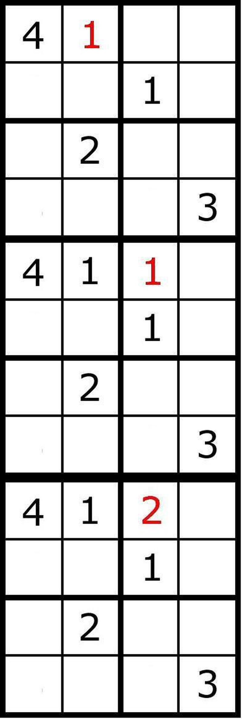 Üst satırdaki son kareyi doldurmaya çalıştığımızda hiçbir sayının şartları sağlamadığını görüyoruz. Bu durumda son varsayımımızın (3. karede 2 olması gerektiği) yanlış olduğunu anlıyoruz ve bu kareye 3 yerleştirerek çözümü geliştirmeye devam ediyoruz.