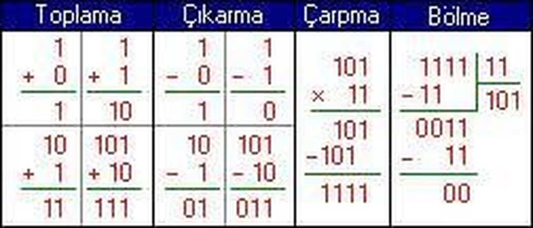 Bu genel bilgilerin ardından artık sadece sayılara yoğunlaşıp bilgisayardaki ikilik sayı sisteminden ve işleyişinden bahsedebilirim. Aslında ele alacağım temel iki sayı gösteriminden ilki tam sayılar olacak ve matematikteki bilinen ikilik sistemle çok benzer bir yapıya sahip. Örnek vermek gerekirse aritmetik işlemler az sonra bahsedeceğim birkaç istisna dışında aynı bu tabloda olduğu gibi yapılmaktadır.