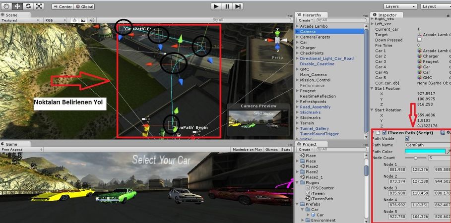 İşte tek bir satırla istediğimiz animasyonu metnimiz üzerinde görebileceğiz. Bu fonksiyonların haricinde, iTween bize fazladan bir de “iTweenPath” isimli bir ek editörü ve kod dosyası sağlıyor. Bu eklentinin bir başka özelliği ise kullanıcıya çalışma alanındaki nesnelerin belirleyebildiği noktalardan geçmesini sağlayan bir hareket animasyonu sağlıyor olması. İndirilen bu kod dosyasında, belirleyeceğiniz yol üzerinde hareket etmesini istediğiniz nesneye atandıktan sonra, sadece kaç tane noktadan geçmesini istediğinizi ve bu noktaların pozisyonlarının ne olmasını gerektiğini ayarlamanız yeterli. Örneğin, bir oyun yarışının başında, yarışma başlamadan önce kameranın arabanızın etrafında ‘artistik’ bir tur atmasını istiyorsunuz. Bunun için gereken adımlar şöyle: