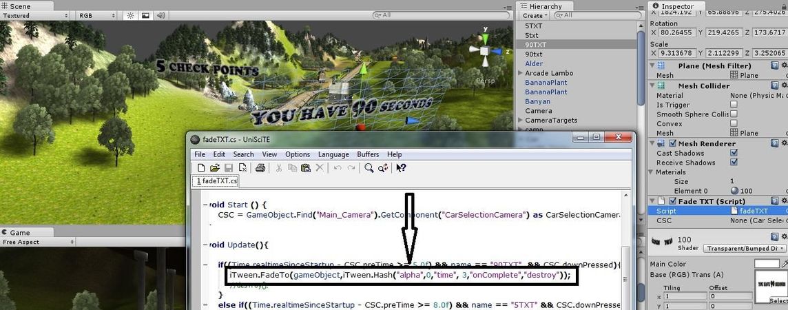 **FadeTo(GameObject target, float alpha, float time) :** target hangi nesnenin yavaş yavaş kaybolacağı, alpha