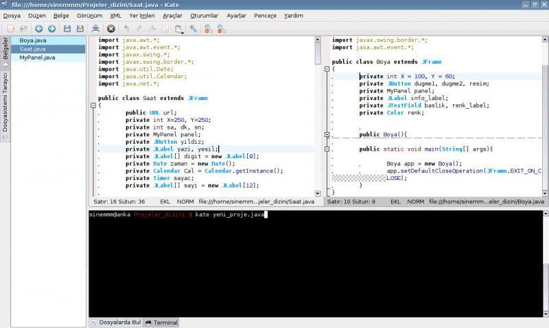 Kate'in en sevdiğim ve sıklıkla kullandığım özelliklerinden biri, birden fazla dosyayı, aynı anda tek ekranda görebilmemize ve istediğimiz herhangi biri üzerinde değişiklikler yapabilmemize olanak sağlamasıdır. Hatta aynı anda bir dosyanın farklı bölümlerini, aynı ekranda istediğimiz çoklukta görebiliriz ve her bir parçasında istediğimiz ekleme, çıkartma ve düzeltmeleri yapabiliriz. Peki bu nasıl yapılıyor? "Pencere" menüsüne tıklayarak, "Dikey Böl" ve "Yatay Böl" seçenekleriyle ana penceremizi istediğimiz çoklukta ve boyutta küçük pencereciğe bölebiliriz. Bunu yaptığımızda yeni oluşturduğumuz kısım, o anda aktif olan pencerenin bir eşi olacaktır. Bu sayede pencerelerden birinde belgemizin üst taraflarına bakarken, diğerinde alt taraflarına bakabiliriz. Açık olan bölümlerden birinde başka bir dosyayı açmamız da mümkün. Bunu da sol yandaki "Belgeler" ve "Dosyasistemi Tarayıcı" ile yaparız. Belgeler menüsünde, o ana kadar Kate ile açtığımız dosyaların listesi, Dosyasistemi tarayıcısında ise bilgisayarımızda bulunan tüm dizin ve dosyaların listesi olacaktır. Burada bir dosya üzerine tıklarsak o anda aktif olan pencere bölümünde dosyamızın açılmasını sağlamış oluruz. Sonrasında "Dosya" menüsündeki kaydetme seçenekleriyle açık pencerelerden istediğimiz birini ya da hepsini kaydedebiliriz. Bunun yanında hali hazırdaki oturumumuzu da kaydetme şansımız var. "Oturumlar" menüsünden "Farklı Kaydet" seçeneğiyle o an ekranda açık olan tüm dosyalarımızı içinde bulundukları pencere bölümlendirme düzeniyle birlikte kaydedebiliriz. Böylece bir sonraki Kate açışımızda oturum seçicisinin bize öntanımlı oturumun yanında daha sonradan oluşturduğumuz bu oturumu da önermesini sağlamış oluruz.
