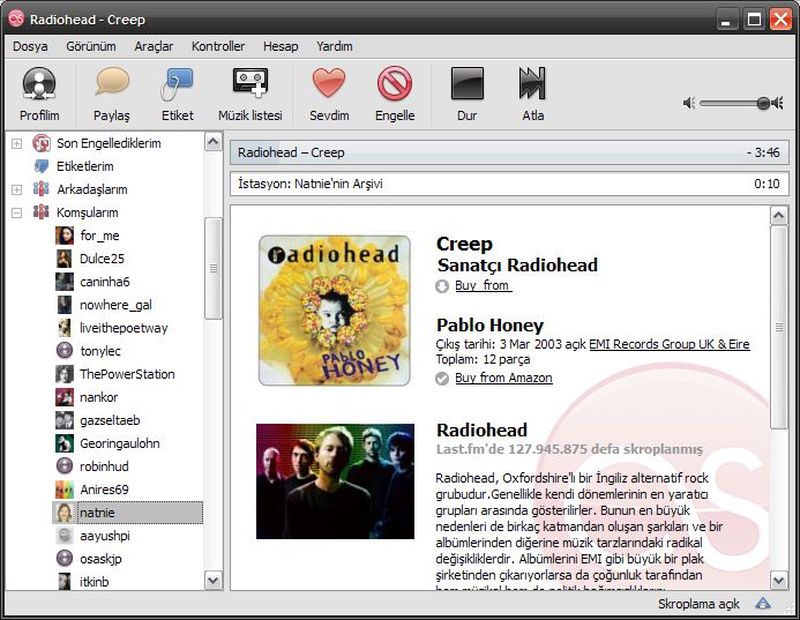 komutu ile last.fm yazılımını sisteminize kurabilirsiniz. Last.fm uygulamasını kullanmak için ücretsiz olarak kayıt olmanız gerekiyor. Kurulum işlemini tamamlayıp da çalıştırdığınızda last.fm solda gördüğünüz gibi basit ve anlaşılır arayüzüyle karşınızda.