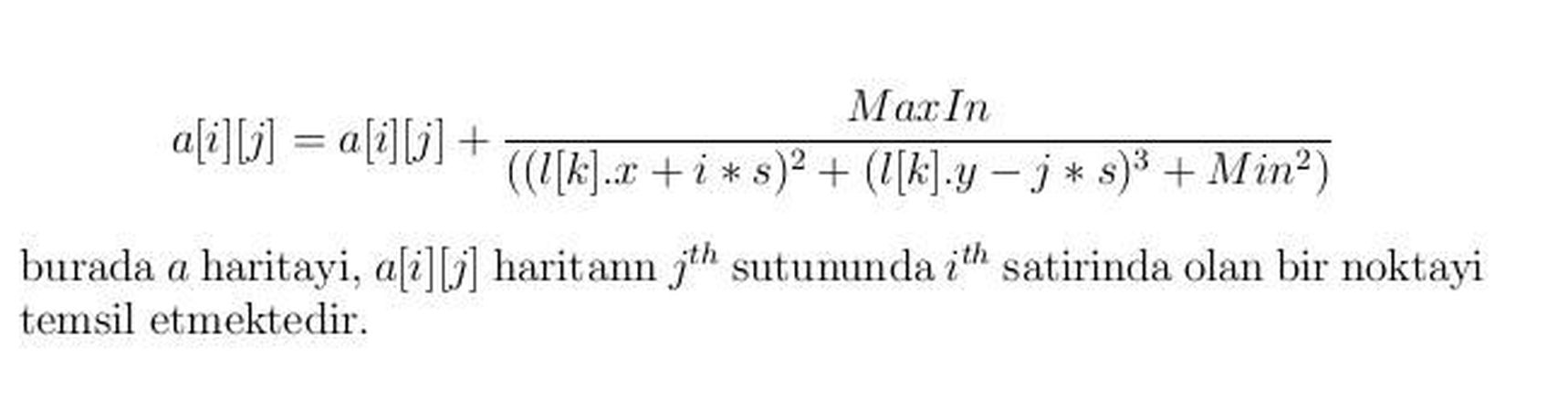 \[a[i][j] = a[i][j] + \frac{MaxIn} {((l[k].x+i*s)^2+(l[k].y-j*s)^3+Min^2)}\]