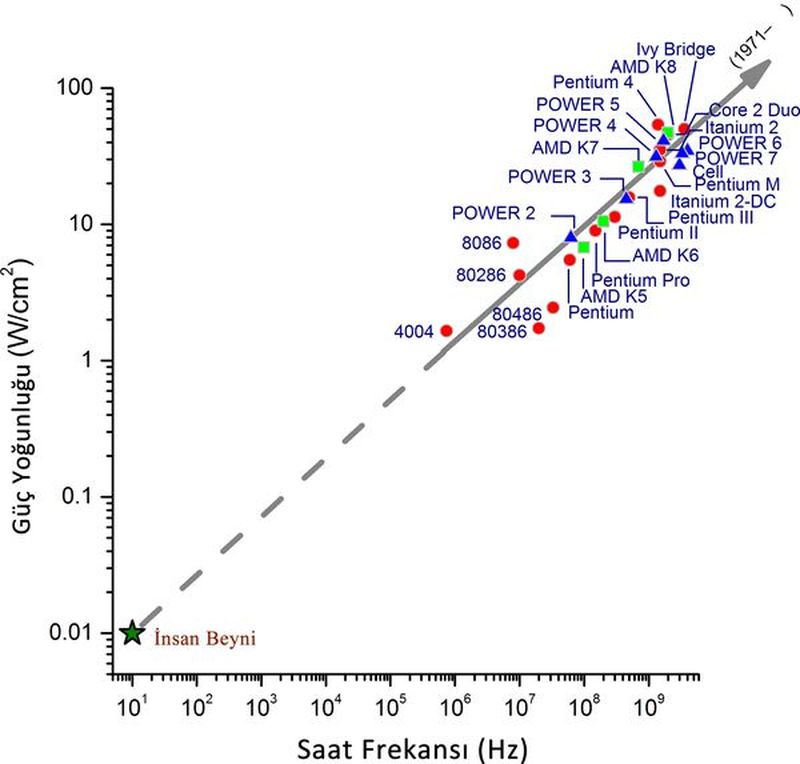 Grafik 2. Seçilmiş bazı işlemcilerin saat frekansı – güç yoğunluğu grafiği