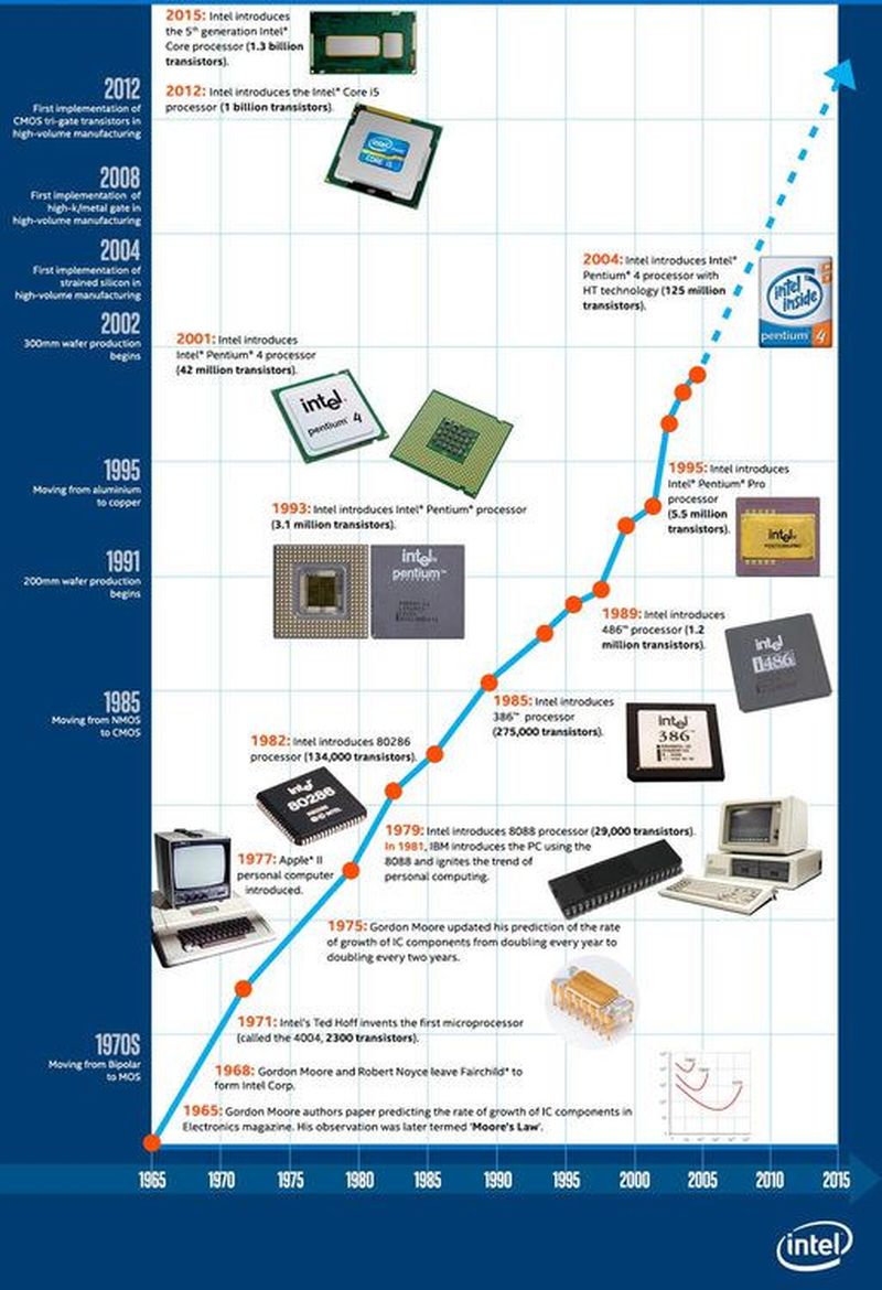 Silikon entegrasyonu hakkındaki bu düşünce, Intel tarafından gerçeğe dönüştürüldü ve dünya çapında teknoloji devi olan Intel’in teknolojik ilerlemesinin simgesi haline geldi. Moore Yasasını baz alan Intel, böylelikle, Intel işlemcilerine ve diğer lider platform bileşenlerine entegre ettiği transistörlerin sayısını gün geçtikçe arttırmış; böylece MHz ya daGHz gibi değerlerle ölçülen saniye başına yönerge sayısı ile ölçülen bilgi işlem performansı ile transistör sayısını kararlı ve güvenilir bir şekilde arttırmayı başarmıştır.[9]