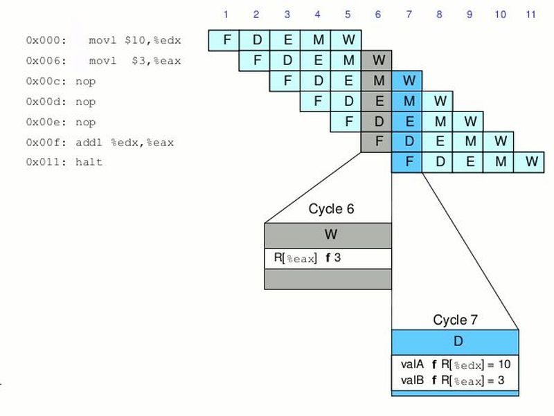 Şekil-2 birbirini izleyen birkaç assembly yönergesinin pipeline bir sistemden nasıl işletildiğini gösteriyor. F,D,E,M,W sırasıyla Fetch,Decode,Execute,Memory ve Write back evrelerini temsil ediyor. Bu kod program registerları olan %edx ve %eax 'e sırasıyla 10 ve 3 yüklüyor. 3 tane nop(hiçbir şey yapmama komutu) yaptıktan sonra da %edx ve %eax'teki değerleri topluyor ve bulduğu değeri %eax'e geri yazıyor ve duruyor. Bu örnek sorunsuz çalışıyor, çünkü 2. movl yönergesiyle addl yönergesi arasında 3 tane nop işlemi var ve bu sayede addl yönergesi fetch evresine geçtiği anda 2. movl write back evresinde oluyor ve addl yönergesi de henüz geri yazılan değeri kullanmaya başlamamış oluyor. Eğer 3 yerine 2 ya da daha az nop yönergesi olsaydı addl ile hesaplanan değer hatalı olacaktı. Yani durumu daha açık bir şekilde ifade etmeye çalışırsak önceki yönergelere “bağımlı” olan bir yönergenin decode evresine geçtiğinde hata oluşmaması için, öncesinde çalışmaya başlayan yönergelerin bitirilmiş olması gerekiyor. Aksi halde hesaplanan değerlerde hata oluşuyor.Bu duruma da veri tehlikeleri(Data hazards) ismi veriliyor. Ayrıca bir yönergenin diğer yönergenin yerini belirlediği jump,call veya return gibi yönergelerde de kontrol tehlikeleri(control hazards) denen durum oluşabiliyor. Daha sonraki yazımda da sizlere veri ve kontrol bağımlılıklarından kurtulmak için kullanılan forwarding ve stalling isimli yöntemlerden bahsedeceğim.Görüşmek üzere... :)