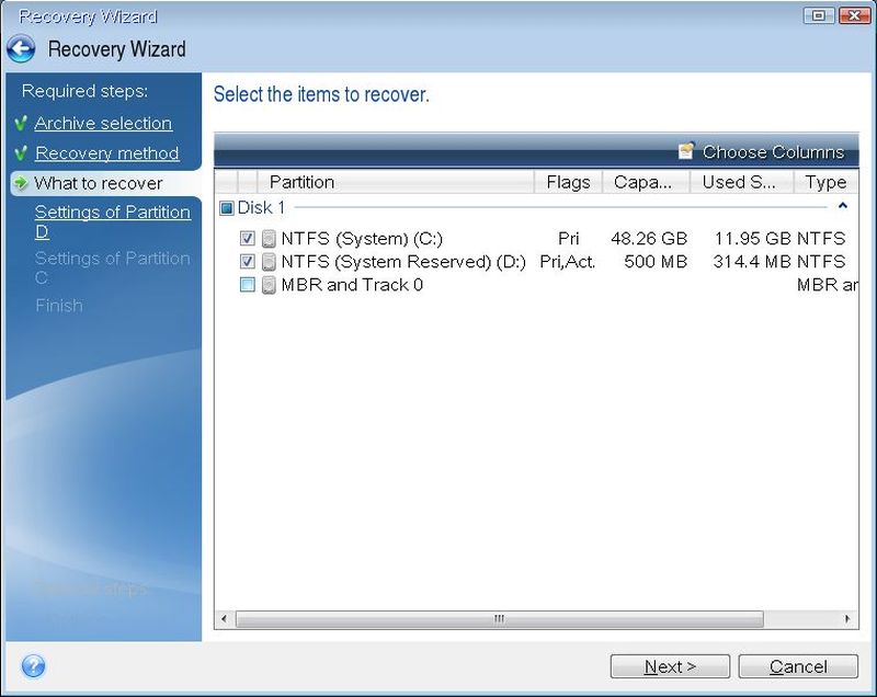 Şekil 2.6. Back Up (Türkçe. Yedek) almak için My Disks (Türkçe. Sürücülerim) tıkladığında uygulama, yedeklenmek istenen sürücülerin işaretlenmesini ister. Burada hedef sürücü, yani üzerindeki verilerin yedeklenmek istenildiği sürücü, System etiketli C sürücüsü ile System Reserved etiketli D sürücüsüdür. D sürücüsü, Windows tarafından işletim sistemi kurulurken sabit disk üzerinde ayrılan alandır. Bu alanda, Windows ile ilgili bilgiler de bulunur ve tam yedekleme yapılırken bu alanın da olası risklere karşı sistem ile birlikte yedeklenmesi gerekir. Şayet Back up sector-by-sector (Türkçe. Sektör sektör yedekle, daha fazla alan gerektirir) seçeneği işaretlenecek olursa disk imajı, sabit disk üzerindeki bilgileri sektör sektör yedekleyecektir. Sektör sektör yedeklenmiş bir sabit disk üzerindeki bilgiler, kurtarma gerçekleştirildikten sonra da yedeklendiği an ile aynı olur.