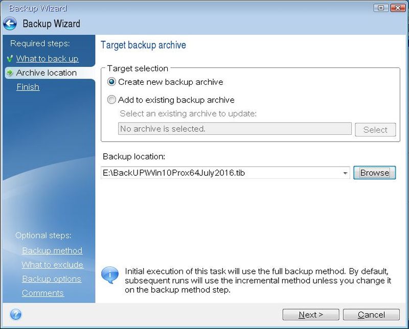 Yeni bir yedek kaydı oluşturduğunuzda ise, eğer aynı isimli bir başka dosya varsa Acronis True Image, aynı isimli dosyayı silmez ya da değiştirmez. Onun yerine aynı adla oluşturulmak istenen dosyaya bir “sayı” ekler. Örneğin; Win10Prox64_July_full_2016_b1_s1_v1.tib isimli dosyanın ismi ile benzer isimde yeni bir kayıt oluşturulmak istenildiğinde _Win10Prox64_July_full_2016_b1_s1_v1-2.tib_ şeklinde yeni dosyaya sıra sayısı eklenir.