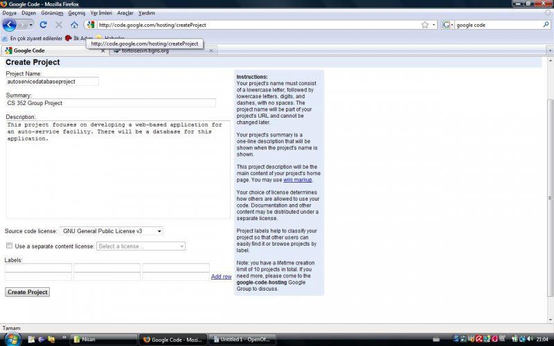 Önce Google Code'dan proje yaratıyoruz.