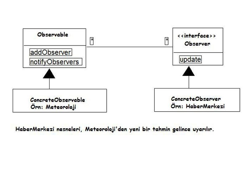 Meteoroloji ve HaberMerkezi sınıfları arasında bir “Gözlemci Deseni” uygularsak, şuna benzer kodlar oluşturmamız gerekecektir: