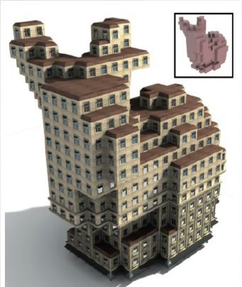 Tersine yordamsal modelleme hakkında en sevdiğim çalışmalardan biriyle başlayacağım. Stanford’dan çıkan Metropolis Yordamsal Modelleme (Metropolis Procedural Modeling) adlı çalışma aslında çok basit bir fikirden yola çıkıyor: Diyelim bir gramerimiz var, kontrolsüz olarak her tarafa büyümesi yerine, ihtiyacımıza yönelik en uygun türetmeyi bulsak? Mesela bir bina gramerimiz olsun, o binayı rastgele sağa sola genişletmektense, parseline göre büyütmek şehir planlamasına daha uygun olur. Veya çılgın bir mimarsınız ve tavşan şeklinde bir bina yapmak istediniz! Bu çalışma sayesinde saatlerce hatta günlerce farklı türetmeler üzerinde çalışmak yerine, sisteme tavşan şeklini verip örneklenecek binayı elde ediyorsunuz! Dolayısıyla yordamsal modellemeye artistik kontrolü getiren çok eğlenceli bir çalışma.