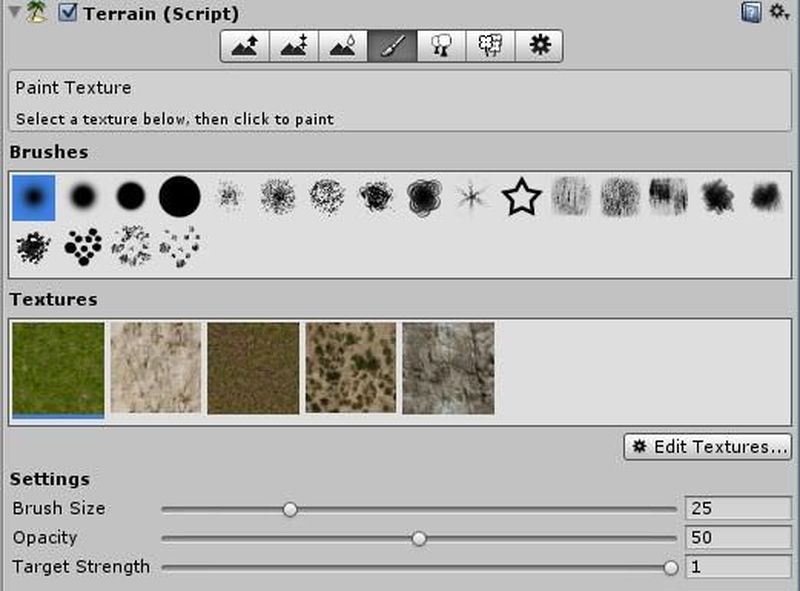 Menü çubuğundan Arazi(Terrain) seçeneğini seçip arazinizi oluşturduktan sonra, bu nesneniz hiyerarşi(hierarchy) sekmesinde yerini alacaktır. Bu sekmede arazi nesnenizin üzerine tıkladığınızda kontrol(inspector) sekmesinde bu nesnenize ait özellikleri göreceksiniz. Bu özellikler arasında arazi(terrain) olarak adlandırılan bir betik (script) bulunuyor. Bu betik, aslında arazi yaratmanızı sağlayan editörü oluşturan betik. Buradaki seçeneklere bakacak olursak;