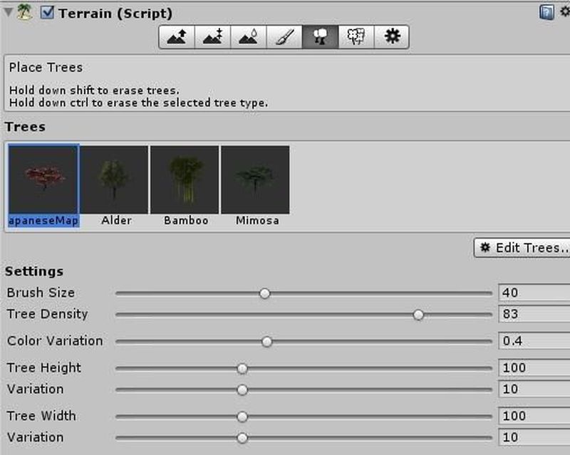Bununla birlikte eğer ağaçlandırmanızda da çeşitlilik istiyorsanız Unity bunun için de ek bir paket hazırlamış durumda. Buradan zip dosyasını indirip çıkarttıktan sonra Arazi Araç Takımı’ndaki gibi paketi projenize ekleyebiliyorsunuz. ‘Terrain Assets’ olarak adlandırılan bu pakette çeşitli ağaç/çalı modelleri ve birden çok farklı doku modelleri bulunmakta. Bu paketi projenize ekledikten sonra herhangi bir betiği arazi objenize taşımanıza gerek yok; projenize eklenmesi yeterli. Etkin olduğunu Unity’nin kendi arazi yaratma editöründeki ağaçlandırma kısmında ağaç tiplerini seçerken görebilirsiniz.