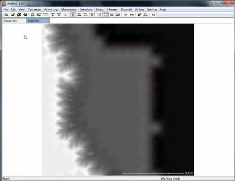 Bu yöntemde yükseklikler gri renk skalasındaki renk değerleriyle eşleştiriliyor. İki boyutlu ve gri tonlarındaki bu heightmap dosyaları sayesinde üç boyutlu şekilleri ifade ve elde edebiliyoruz. Unity’de “.raw” uzantılı bu heightmap dosyalarını arazinize uygulayarak heightmap’te belirlediğiniz yükseltilerin belirlediğiniz koordinatlardaki sonucunu görebiliyorsunuz. Harici olarak ‘3D Terrain Generator’ ifadesiyle anılan arazi yaratma programları sayesinde yükseklik haritalarını Unity projemize ekleyip etkin hale getirebiliyoruz. Bu yöntem için ise güzel bir örnek ‘L3DT’ adlı bir program. Şu bağlantıda ve wiki adresinde de adım adım anlatıldığı üzere L3DT programında başlangıçta heightmap’inizin genişlik ve yüksekliğini belirliyorsunuz. Ardından Paint programına benzer bir mantıkla, belirli yükselti değerlerini seçip fırçayla arazinizi sembolize eden heightmap alanlarını boyuyorsunuz. Ardından hazırladığınız bu iki boyutlu resmi heightmap’e çeviriyorsunuz. Çevirdiğinizde alçak yerlerin siyaha yakın yüksek yerlerin de beyaza yakın renkte olduğunu göreceksiniz.