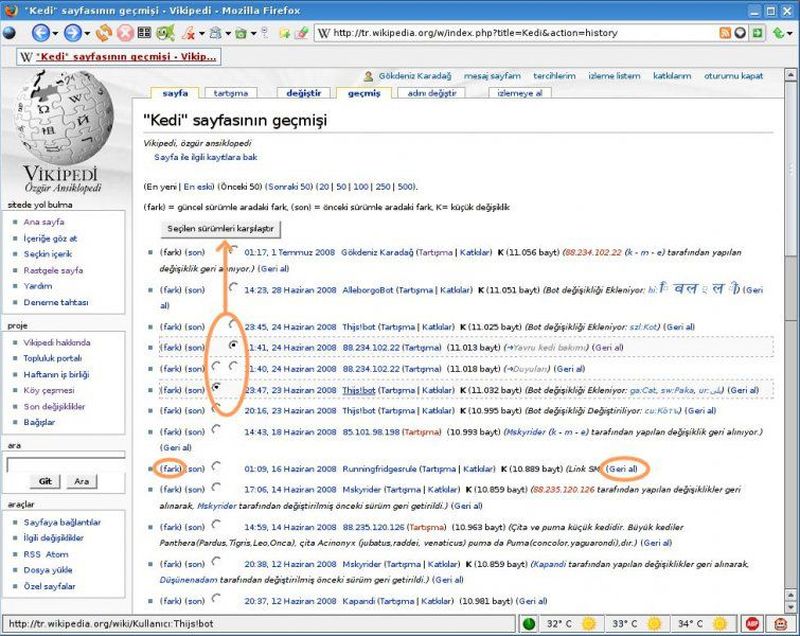 Sayfa geçmişinde, ilgili maddenin üzerinde yapılmış olan tüm değişiklikler listelenir. Herhangi bir değişiklikle maddenin mevcut sürümü arasındaki farkı görmek için değişikliğin solundaki "fark" bağlantılarını kullanabilirsiniz. Herhangi iki sürüm arasıdaki farkı görmek için de sol taraftaki yuvarlak düğmeleri kullanarak bu iki sürümü seçip "Seçilen sürümleri karşılaştır" düğmesine tıklayabilirsiniz. Bu fark ekranında; solda daha eski sürüm, sağda daha yeni sürüm olmak üzere maddenin sadece değişiklik yapılan kısımları gösterilir, bu değişiklikler kırmızı renk ile vurgulanır. Fark ekranında "Önceki sürümle aradaki fark" bağlantısına tıklayarak daha eski değişiklikleri görebilirsiniz.