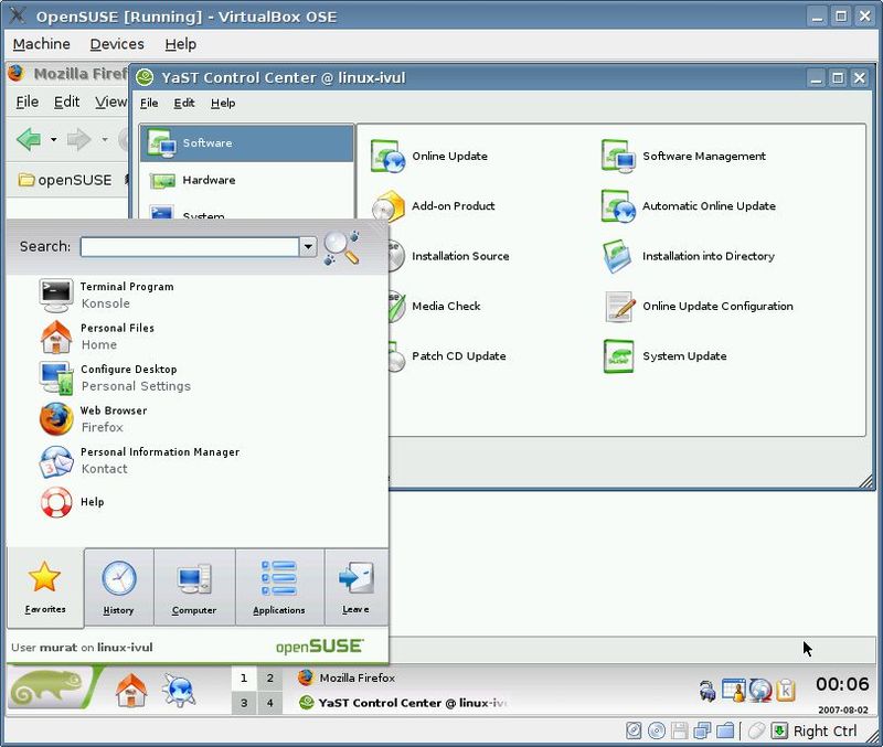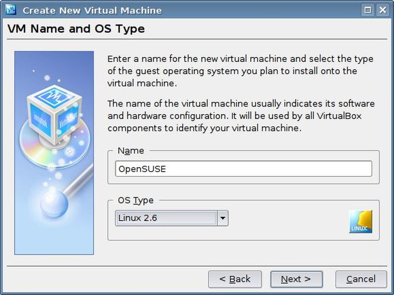 Şimdi kaldığımız yere geri dönelim ve sanal makineyi oluşturmaya devam edelim. Yeni pencerede kuracağımız işletim sisteminin adını ve türünü seçip devam ediyoruz. Biz, bilgisayarımıza OpenSUSE kurup incelemeye karar verdik. Daha sonra işletim sistemine ayıracağımız bellek miktarını belirleyeceğiz. Varsayılan olarak gelen miktarı genelde değiştirmek gerekmez. Biz donanımımız yeterli olduğundan daha yüksek performans için 128MB'ı 256MB'a çıkarıyoruz. Sihirbazın sonraki aşamasında bizden bir sabit disk görüntüsü (vdi) dosyası belirlememiz istenecek. Daha önce bir vdi dosyası oluşturmadığımız için "new" tuşuna basıyoruz. Artık yeni bir sihirbazla karşı karşıyayız. İlk iki adımda "Next" tuşuna bastıktan sonra, üçüncü adımda dosya adını ve boyutunu belirliyoruz. Bunun için boş yer bulunan bir disk bölümünü seçmemiz gerekiyor. İşlemleri bitirdikten sonra yeni sanal makinemizi oluşturmuş oluyoruz. Yeni yarattığımız makine, ana pencereye eklenmiş olacak. "Settings" seçeneğine basıp çıkan pencerede makinenin kurulumunu yapacağımız CD/DVD sürücüyü ya da iso dosyasını seçmemiz gerekiyor. Artık gönül rahatlığıyla makinemizi çalıştırabiliriz :)