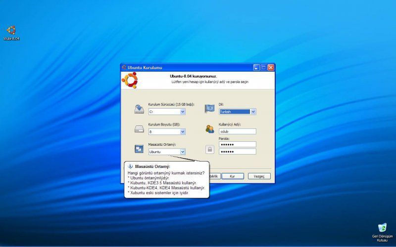 Bu ayarları yaptıkran sonra "Kur"a basıp biraz başka şeylerle ilgileniyoruz. WUBI de bu arada bizim için depodan Ubuntu'yu indiriyor . Daha sonra bakıyoruz bize demiş ki "Bilgisayarı yeniden başlatayım mı?". Başlat bakalım diyoruz, bu sefer Windows başlamadan önce karşımıza bir seçim ekranı geliyor. Ubuntu'yu seçip devam ediyoruz, sonra yine biraz dolaşmaya çıkıyoruz. Bu arada WUBI bizim için diski bölümlendiriyor, dosyaları kopyalıyor, sistem ayarlarını yapıyor, sonra bilgisayarı yeniden başlatıyor. Ve işte bitti, bu kadar... Yeni Ubuntu'nuzu güle güle kullanın...