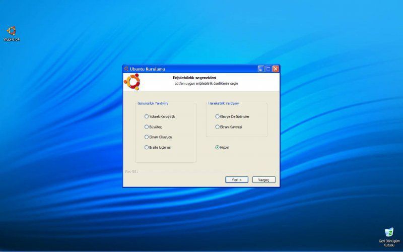 Birkaç kurulum özelliği de engellilerimiz için eklenmiş (Resim - 2). Dilerseniz erişilebilirlik butonundan bir dizi özelliği ekleyebilirsiniz, varsayılan olarak hiçbiri kurulmuyor. Bu özellikler:
