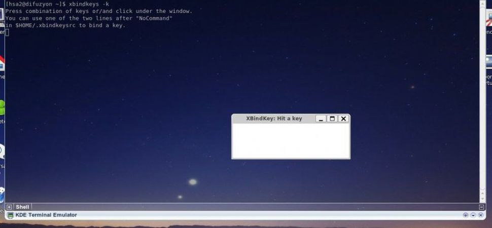 X açıkken, xbindkeys -k komutunu çalıştırın, küçük bir pencerenin açıldığını göreceksiniz [1]. Bu pencere etkinken, kısayol atamak istediğiniz tuşa basın. Xbindkeys konsolda basılan tuşu ve ayar dosyasına eklenmesi gereken kodu verecektir [2].