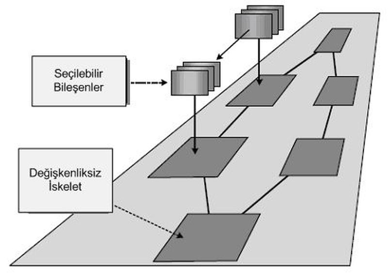 Şekilde görülen miras ilişkisinde Sınıf2 Sınıf1’in özelliklerine sahip olmaktadır. Bu sayede Sınıf1’in tüm özellikleri Sınıf2 için kullanılabilir olacaktır. Ancak bu yaklaşımın da hataya ve YK’nın esnekliğine zarar verecek gelişmelere açıklığı vardır. Sınıf1’de yapılan bir değişiklik Sınıf2’ye doğrudan yansıyacağından istenmeyen sonuçlara sebep olabilir. Nesne tabanlı iskeletlerde (Object oriented framework) bu sıkıntıya sıkça rastlanmaktadır ve bu sorun kırılgan miras yapılı sınıf problemi olarak bilinmektedir (Fragile base class problem). İskeletlerin değişen versiyonları ile birlikte iskelete bağımlı uygulamaların çalışmasında ciddi sorunlar olabilmektedir. Nesneye yönelim paradigmasından sonra bileşen yönelimli yaklaşımların literatürde yer edinmesi ile bileşen tabanlı iskeletler ortaya çıkmaya başlamıştır. Bileşen teknolojisi YK için büyük öneme sahiptir. Bileşenler tanımlı arayüzleri, ki bu arayüzler sadece bileşenlerin sağladığı veya sunduğu servisleri tanımlamakla kalmayıp; performans, zamanlama, servis kalitesi (Quality of Service, QoS) gibi farklı gerekleri barındırabilme özelliğine sahiplerdir. Aşağıdaki şekilde göründüğü üzere, bileşen tabanlı iskeletin değişkenliklerden yoksun kısımlarında tanımlı arayüzlere seçilebilir bileşenlerin yerleşmesi vasıtasıyla uygulamalar oluşturulabilmektedir.