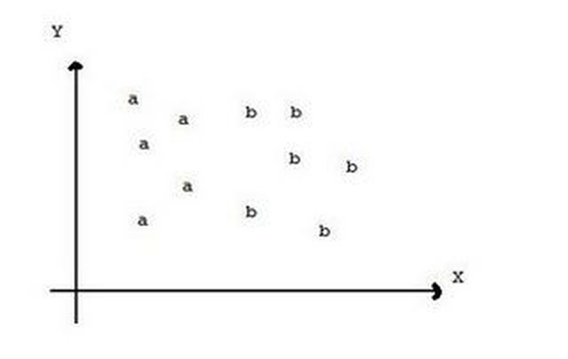 Elimizde veri olarak bir koordinat düzlemine yerleştirilmiş beş "a" ve altı "b" nin koordinatları olsun.
