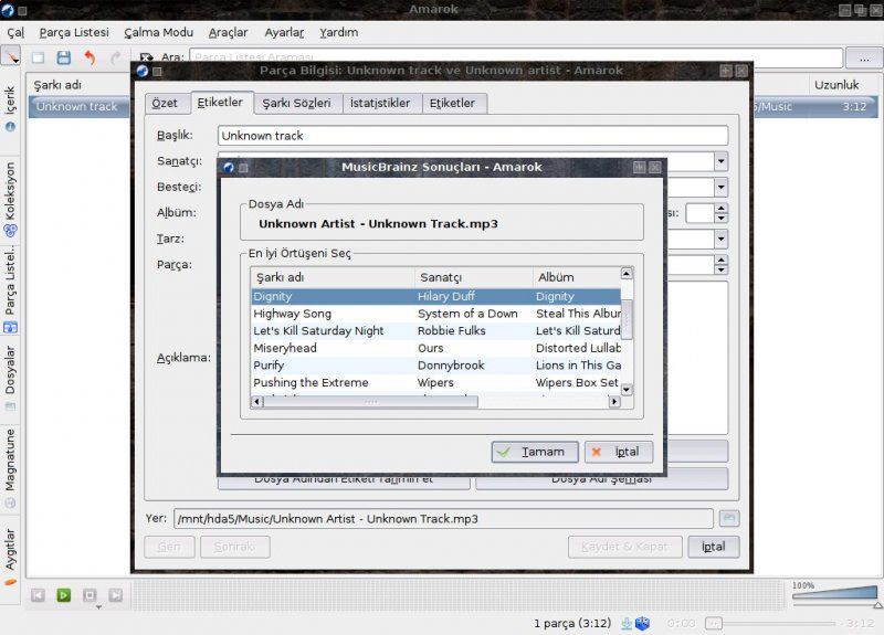 Hayal kırıklığı ile aynı parçayı tekrar tekrar mı dinlerdiniz? Hayır. İşte Amarok, işte 'MusicBrainz'! Çalma listesindeki, hakkında hiçbir bilgimiz olmayan parçaya sağ tıklayıp 'Parça için parça bilgilerini düzenle'yi seçiyoruz. Karşımıza gelen ekranda aşağıdaki 'MusicBrainz kullanarak etiketleri doldur' butonuna basıp biraz bekliyoruz. Biz sadece bekliyoruz, Amarok ise içeriği binlerce gönüllü tarafından sürekli olarak denetlenen, 290 bin şarkıcı/grup, 460 bin albüm ve 5,5 milyon parçanın bilgilerini içeren MusicBrainz veritabanında sizin dinlediğiniz parçanın 'akustik parmak izi' ile eşleşen parçaları araştırıyor. İşi bittiğinde de, size araştırma sonuçlarını sunuyor... Ne harika değil mi?!