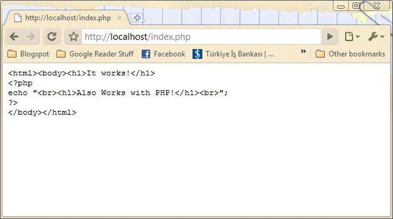 Eğer tarayıcınız dosyanın içeriğini tüm HTML tag'leri ve PHP keywordlerini de gösterecek şekilde ekrana döküyorsa PHP kurulumunuzda sorun var demektir. Aşağıdaki ekran görüntüsü PHP kurulumunda sorun olması durumunda alacağınız çıktıyı göstermektedir.