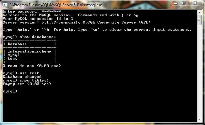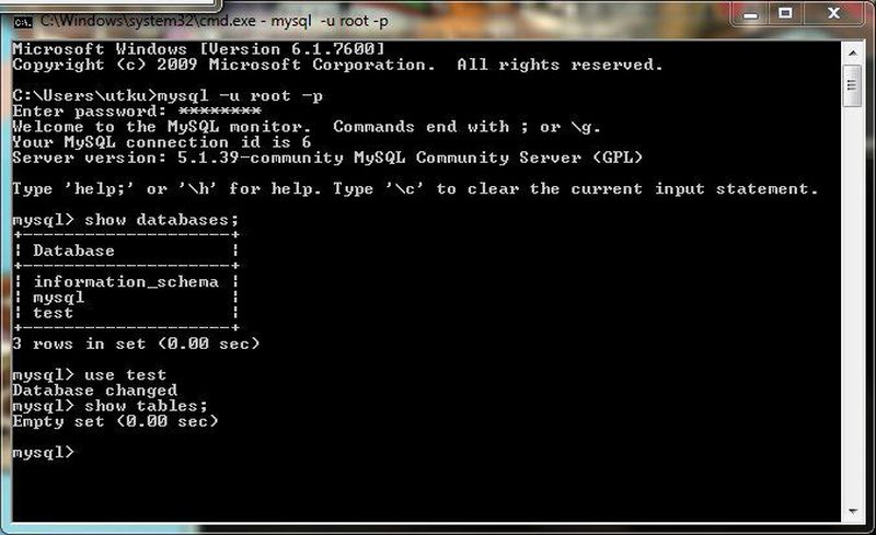 (Test) MySQL sunucuyu servis olarak kurduysanız ve otomatik olarak başlamasını seçtiyseniz kurulum sonunda MySQL sunucunuz başlayacaktır. MySQL sunucuya bağlanmak için MySQL kurulumu sonrasında Start Menu içerisine kısayolu eklenen MySQL Command Line Client 'ı kullanabilirsiniz. Programı çalıştırdığınız zaman size şifre soracaktır. Şifre olarak root kullanıcısı için atadığınız şifreyi girebilirsiniz. Eğer veritabanına giriş yaptıysanız MySQL sunucu problemsiz kurulmuş demektir. Aşağıdaki ekran görüntüsündeki komutları verip sunucunun düzgün çalıştığından emin olabilirsiniz.