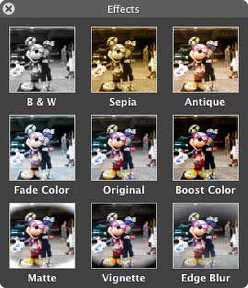 Effects: Resme genel efektler vermenizi sağlar. Ortada resmin efektleri uyguladığınız versiyonunu görürsünüz ve çevresindeise uygulanabilecek 8 farklı efektin sade olarak uygulanmış hali yer alır. Bunlar sağ üstten başlayarak: