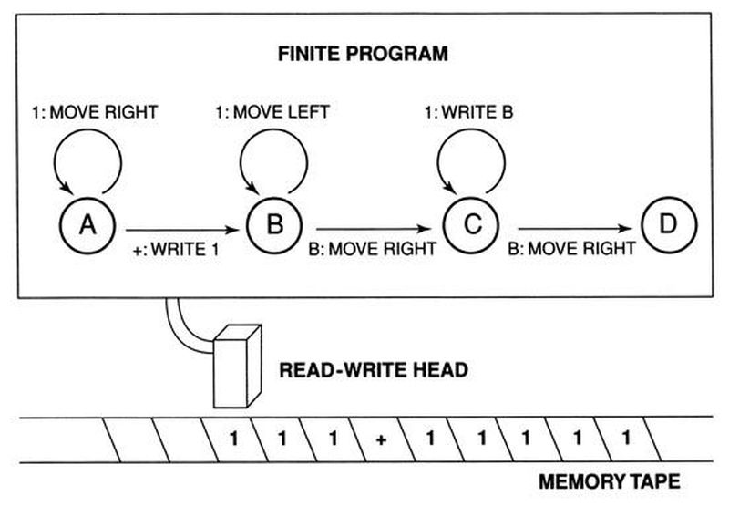 Turing makinesi adından da anlaşılabileceği üzere Alan Turing’in geliştirmiş olduğu sanal bir makinedir ve bilgisayar bilimine katkısı çok fazladır. Bu makineden biraz bahsedecek olursak; Turing makinesi bir hesap yöntemini belirli bir yol izleyerek yapan bir makinedir. Bu hesaba giren veya çıkan sayıların büyüklüğü makine için önemli değildir. Önemli olan şey sınırlı bir zaman aralığında bir çözümün var olup olmadığıdır. Bu yüzden sanal makinemizi tasarlarken sonsuza kadar uzanan girdi ve çıktı değerleri düşünmemizde bir sakınca yoktur. Her işlem esnasında gerekli değişiklikleri yapmak için bir yer belirleyicisine de ihtiyacımız olacaktır. Tüm bunları sağladıktan sonra karşımızda bir Turing makinesi görüyor olacağız.