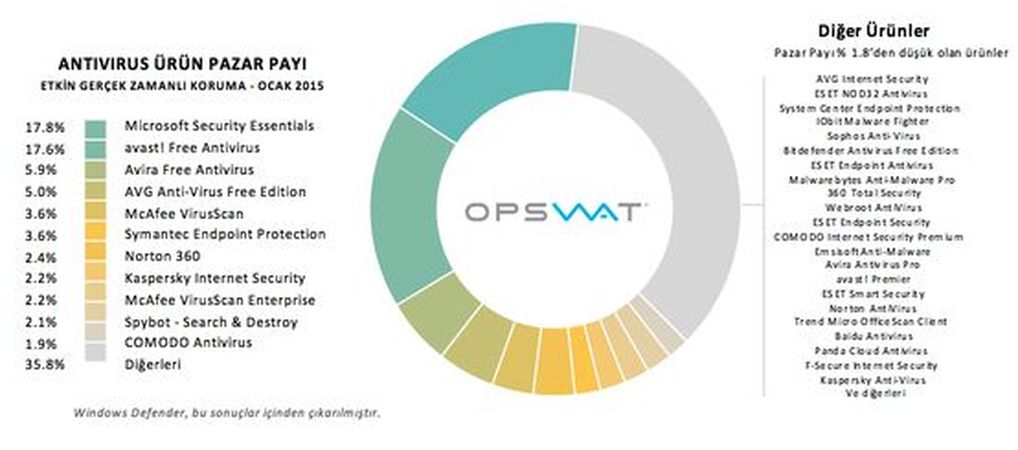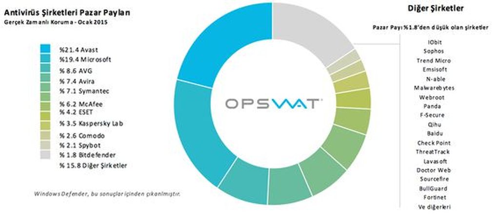 [7]İlgili sonuçlar, ücretsiz olarak yüklenebilen OPSWAT GEARS uygulamasının yüklendiği bilgisayarlardan elde edilmiş veriler ışığında elde edilmiştir. İlgili istatistiki sonuçları gösteren veriler 2 Ocak 2015 tarihinde toplanmıştır. Bu veriler, gerçek pazar payını yansıtma iddiası ile oluşturulmuş veriler değildir ve OPSWAT, bu verilerin doğruluğu üzerinde hiçbir iddiada bulunmamaktadır. Raporu ayrıntılı olarak incelemek için lütfen https://www.opswat.com adresini ziyaret ediniz.