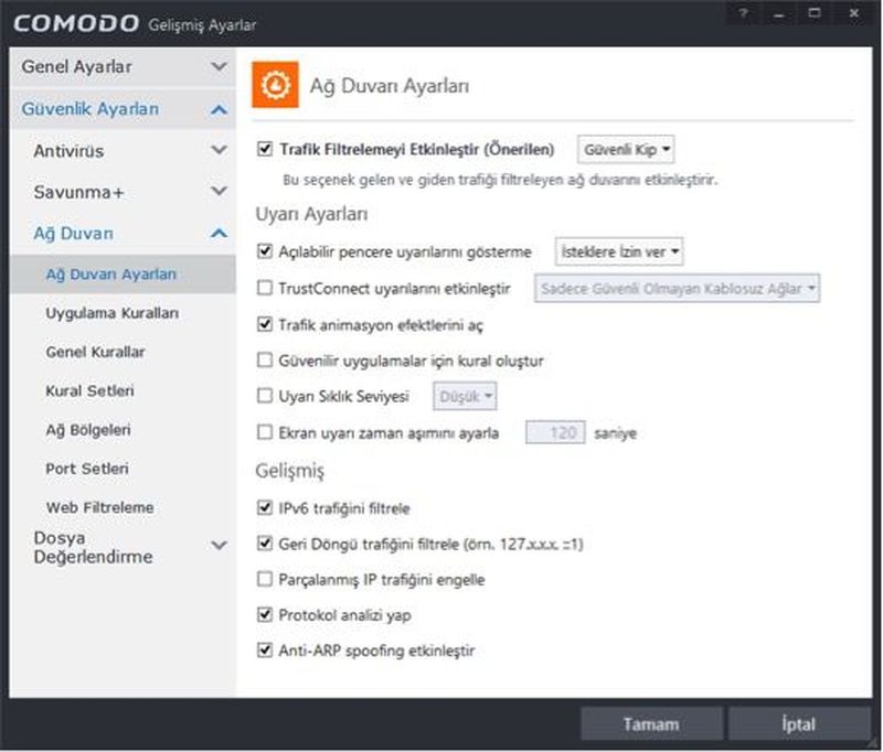 Şekil 6. Comodo Internet Security Premium – Ağ Duvarı uygulamasının ayarları