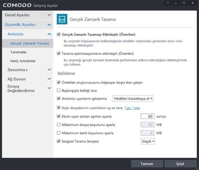 Şekil 3. Comodo Internet Security Premium – Antivirüs uygulamasının Gerçek Zamanlı Tarama ayarları