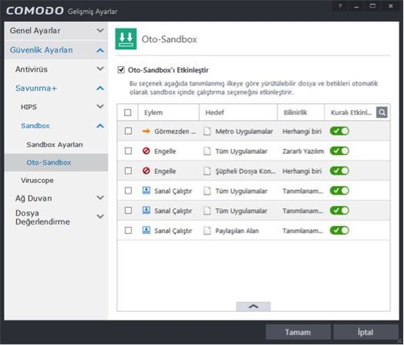 Şekil 5. Comodo Internet Security Premium – Oto Sandbox uygulamasının ayarlarından bir görünüm