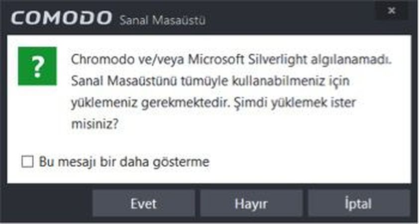 Comodo Sanal Masaüstü uygulamasının çalıştırılabilmesi için sistemde Chromodo ve Microsoft Silverlight® uygulamalarının kurulu olması gerekmektedir.