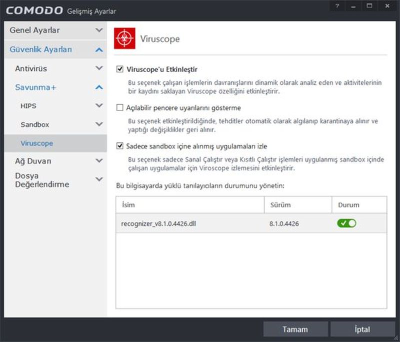 Şekil 4. Comodo Internet Security Premium – Viruscope uygulamasının ayarları